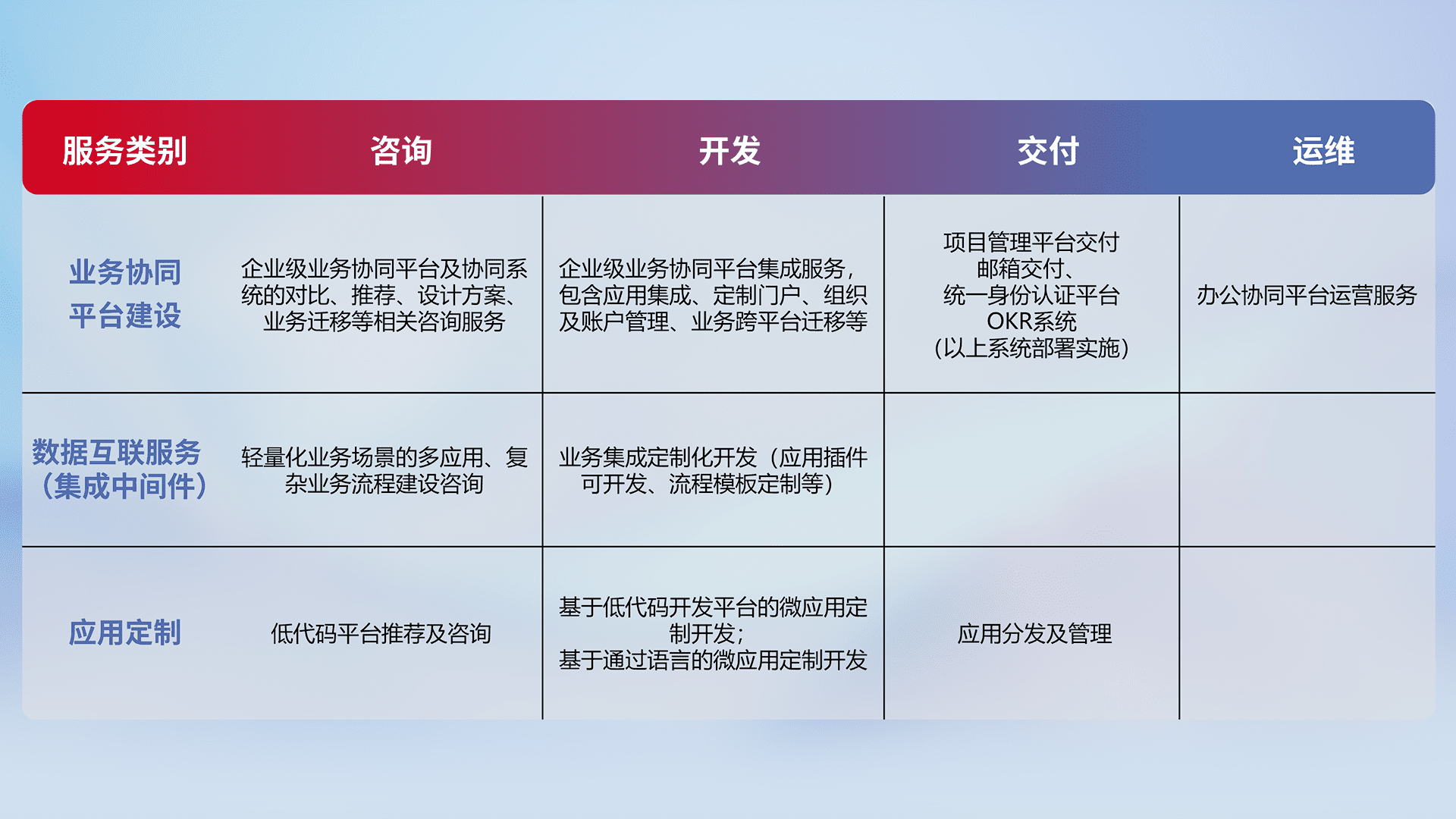 针对钉钉、、、、企微、、、、IDaas等平台级产品提供产品的规划、、、方案、、、、交付、、、、定制化开发等服务,,,,实现如统一协同办公、、智能客户服务、、、混合会议管理、、、智能数据查询、、等业务场景,,,实现数字化转型。。。